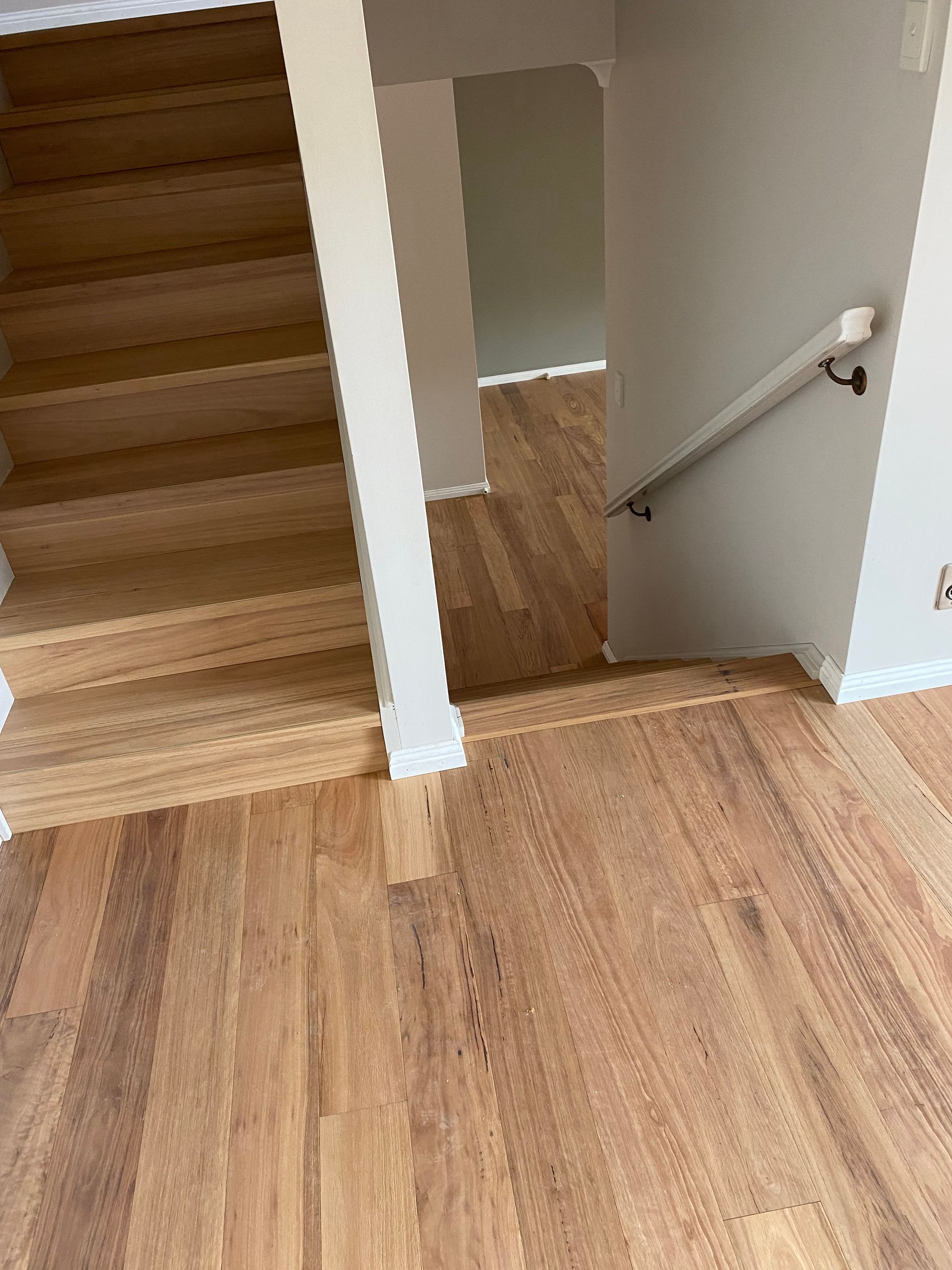 - Matching 12mm Blackbutt Water-Resistant Laminate Flooring for the upper level and staircases — a durable, family-friendly option that mirrored the timber’s look and texture.
